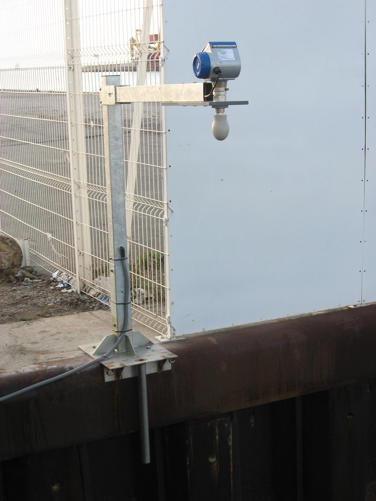 Suite à de nombreux problèmes liés à l’envasement du port de Calais entraînant une perte de données (ou des doutes dans celles-ci), un nouveau type de capteur radar (Khrone Optiwave) a été installé. Ce dernier, [*fixé en plein air au bout d’une potence*] (cf. image ci-contre, à gauche), s’affranchit ainsi des problèmes d’envasement du puits de tranquillisation, et des erreurs de filtrage non-linéaire qui peuvent survenir entre l’intérieur et l’extérieur d’un puits de tranquillisation (Voir par exemple l’Annexe C du livre sur "La Marée" par B.Simon, publié par l’Institut Océanographique en 2007).