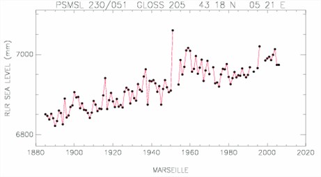 Enfin, rappelons que ce site fait partie du programme mondial GLOSS d’observation du niveau des mers et possède une série qui couvre plus de un siècle de variations du niveau de la mer (ci-dessous les moyennes annuelles disponibles au PSMSL).
