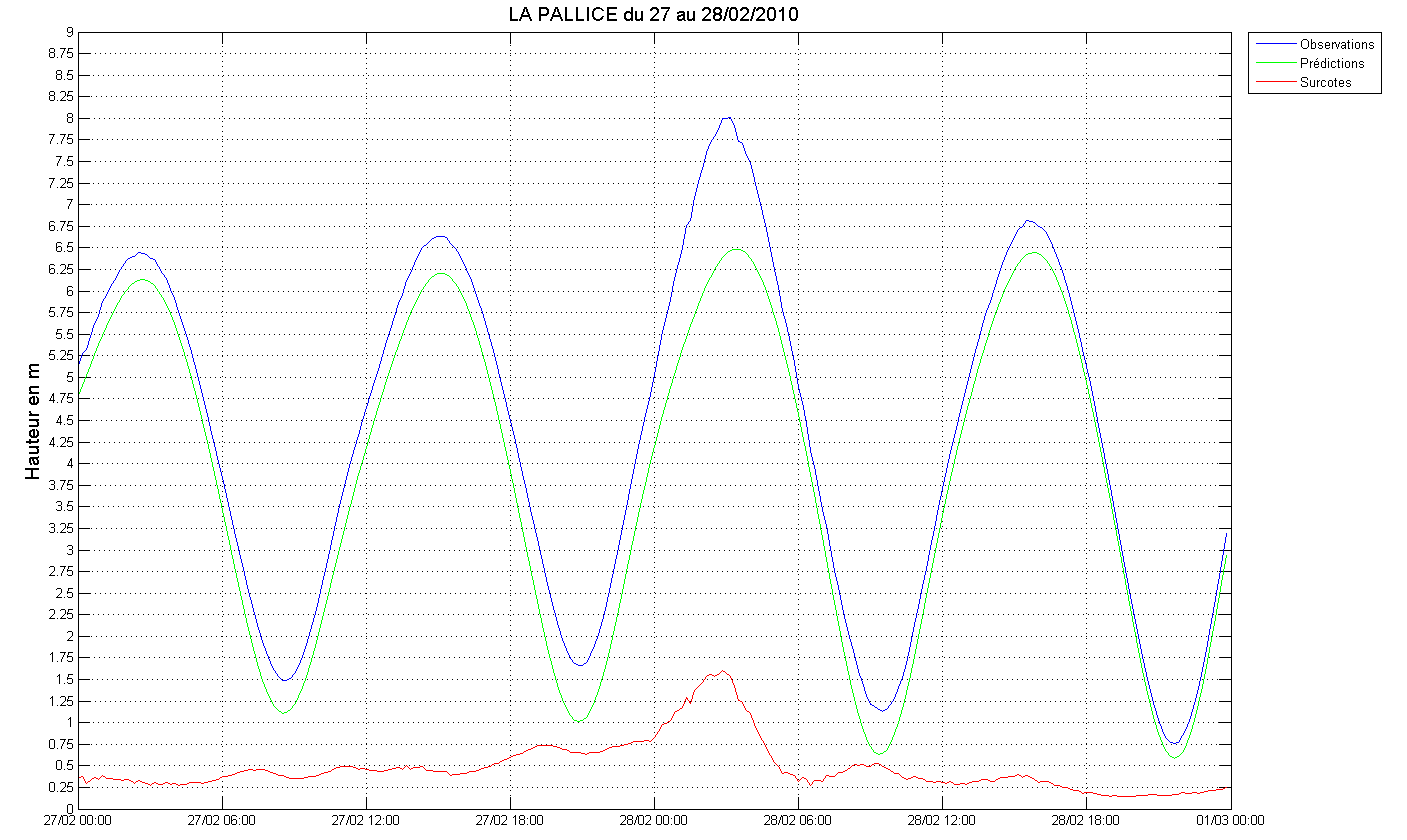 L’image ci-dessous (cliquez pour agrandir) montre les prédictions (en vert) et les observations (en bleu) des hauteurs d’eau à La Rochelle - La Pallice entre le samedi 27 février minuit et le dimanche 28 février minuit. Les surcotes sont présentées en rouge.