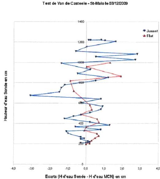 Des contrôles manuels in situ plus poussés sont occasionnellement réalisés sur un cycle de marée complet (test de Van de Casteele). Ce test consiste à comparer les mesures acquises par le marégraphe à des mesures de hauteur d’eau de référence effectuées le plus souvent avec un repère nivelé et une sonde lumineuse et ce, pendant un cycle de marée complet en période de vives-eaux. Ce test permet de déterminer les coefficients de calibration qui vont être appliqués à l’instrument. Le SHOM réalise systématiquement un test de Van de Casteele lors de l’installation d’un marégraphe. Plus de détails sur le test de Van de Casteele